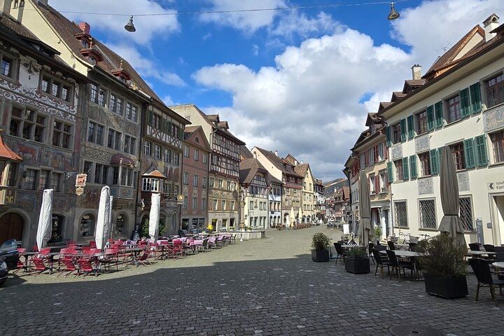Explore the cobblestone streets, local shops and cafes of the medieval town Stein am Rhein along the Rhine river.