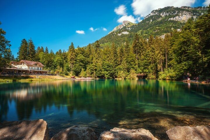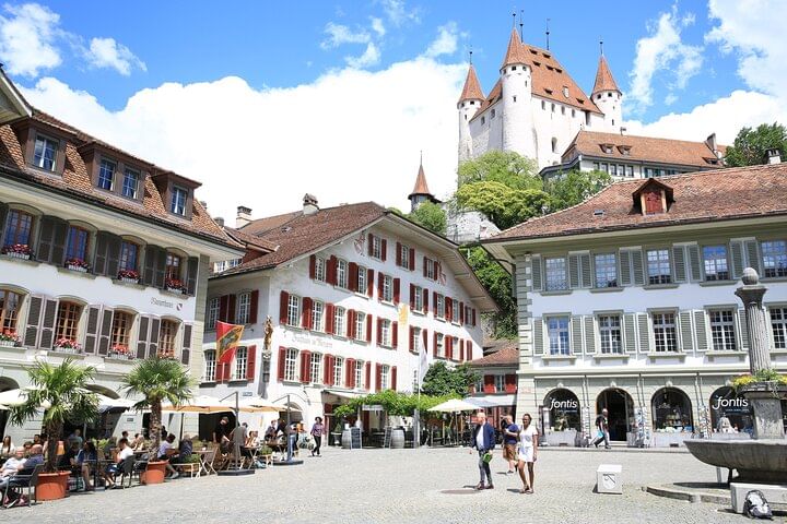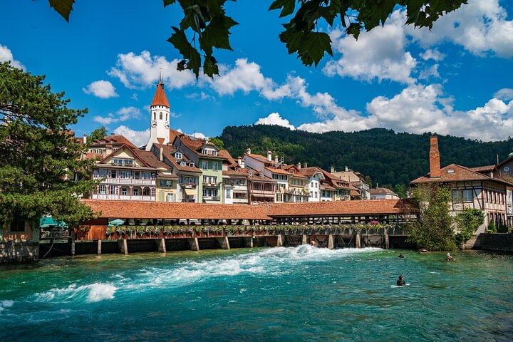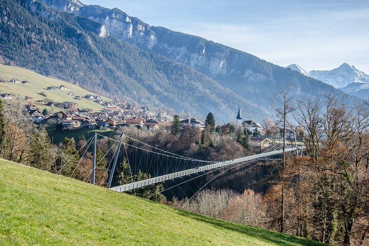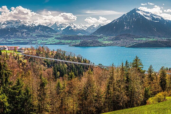 Embark on an intimate adventure with our small-group tour from Interlaken. Begin your journey at the mystical Beatus Caves, then cross the thrilling Suspension Bridge in Sigriswil, known for its captivating scenes from "Crash Landing on You." Explore the charming city of Thun for two hours, soaking in its rich history. The tour culminates with a visit to the enchanting Blausee (Blue Lake) before returning to Interlaken. Limited to six people, this exclusive tour promises an immersive and personalized experience through the wonders of the Swiss landscape.