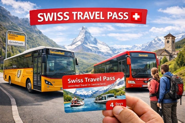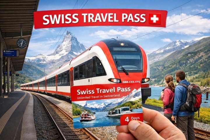 The Swiss Travel Pass offers unlimited travel on Switzerland’s trains, buses, and boats.